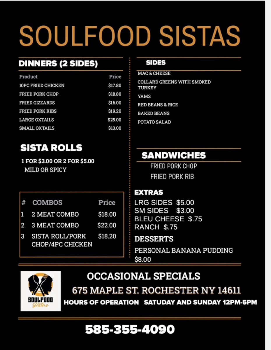 Soulfood Sistas Menu opens the door to comfort food that feels like a warm embrace the moment you step into 675 Maple St in Rochester. The dishes are packed with slow-cooked flavors that remind you of family gatherings, from crispy fried chicken that’s tender on the inside to collard greens seasoned just right. There’s a welcoming sense of home in every bite, and the sides aren’t merely add-ons - mac and cheese comes creamy and rich, cornbread has that perfect hint of sweetness, and yams glow with buttery warmth.